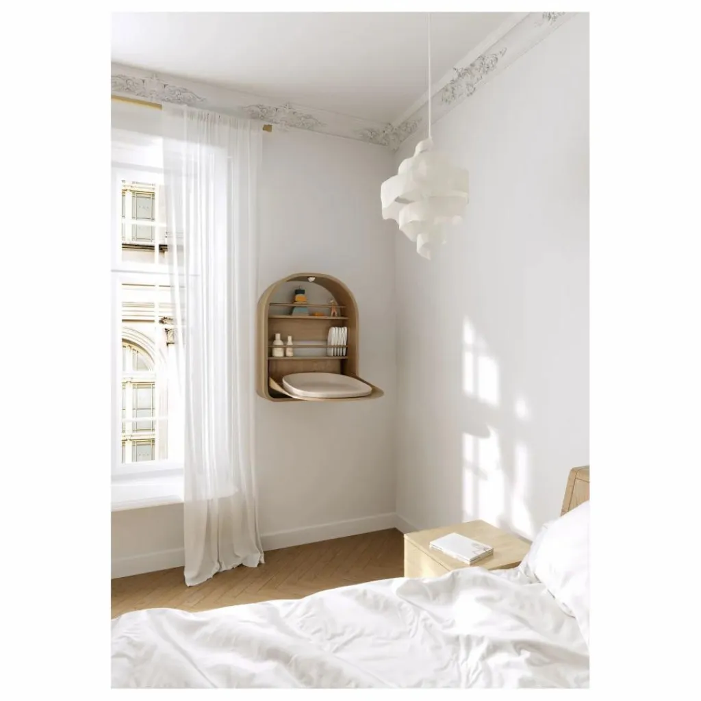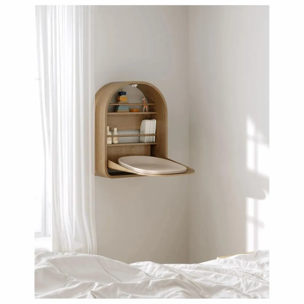 - La table à langer murale Kai allie esthétique et fonctionnalité avec ses formes douces et arrondies. Parfaite pour les petits intérieurs et les espaces réduits, elle offre à la fois gain de place et élégance.Grâce au système Easy Touch, la table à langer s’ouvre et se ferme en toute simplicité, pour un usage pratique et intuitif.Deux étagères spacieuses, placées juste au-dessus de vous et de votre bébé, permettent d’avoir tout à portée de main – crèmes, couches, lingettes et autres indispensables.Le matelas à langer ovale Kai s’adapte parfaitement à la table, offrant une solution harmonieuse et fonctionnelle pour le change.