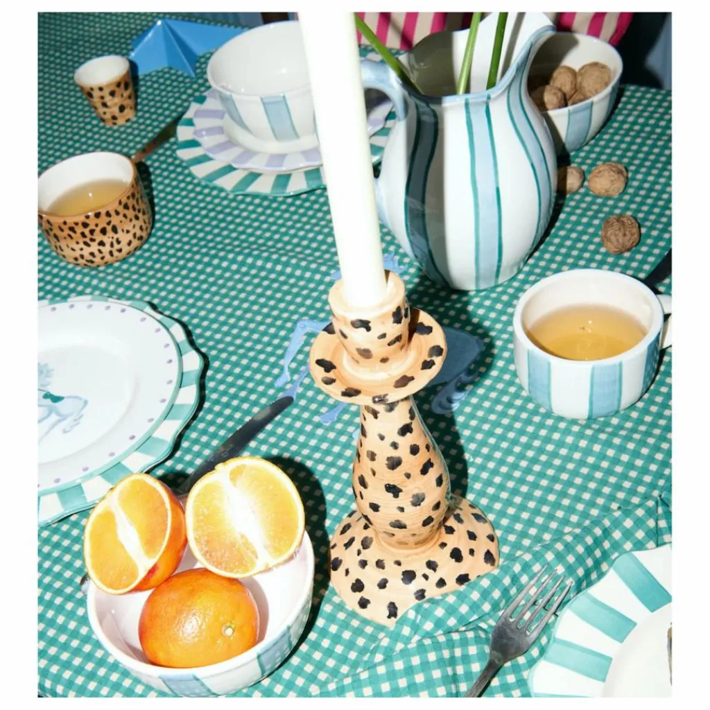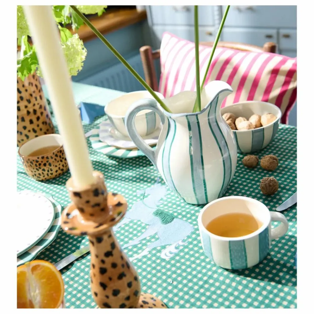 - La tasse à cappuccino Powder Striped est une pièce ludique peinte à la main avec un motif éclectique à rayures bleues et turquoises qui garantit un café matinal énergisant et joyeux.