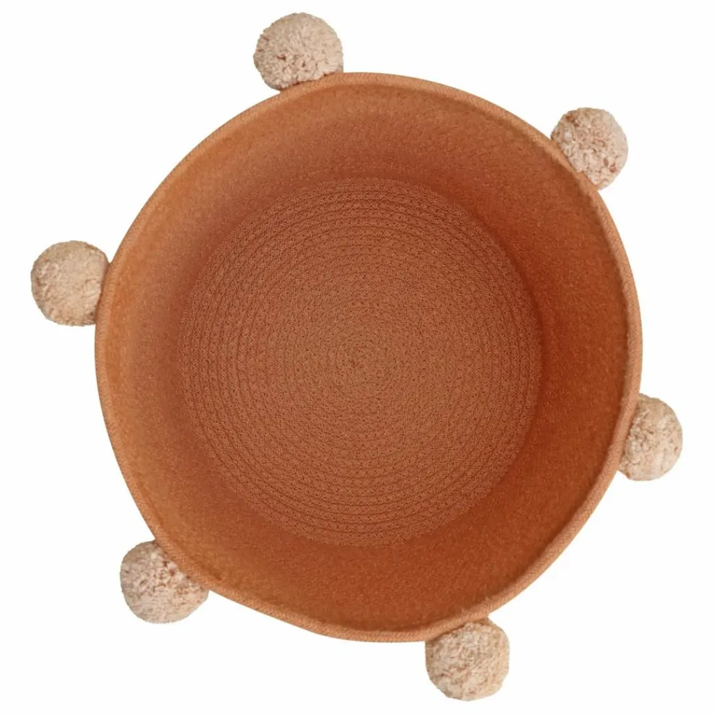 - Panier en cordon de coton tressé de couleur bleu sauge et fini avec 6 pompons en coton marron