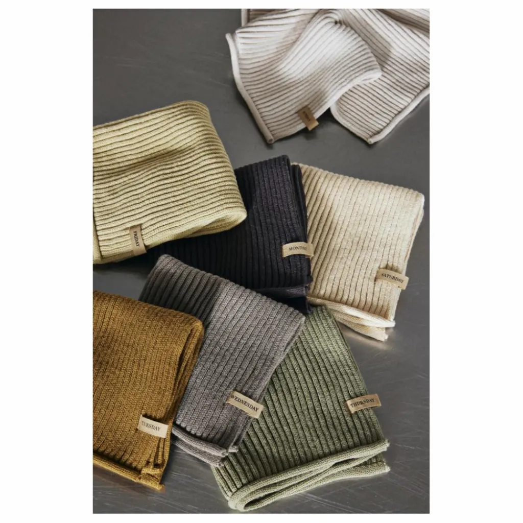 Célébrant chaque jour de la semaine, les torchons de jour se présentent sous la forme d’un lot de sept torchons, chacun portant une étiquette tissée indiquant le jour de la semaine.