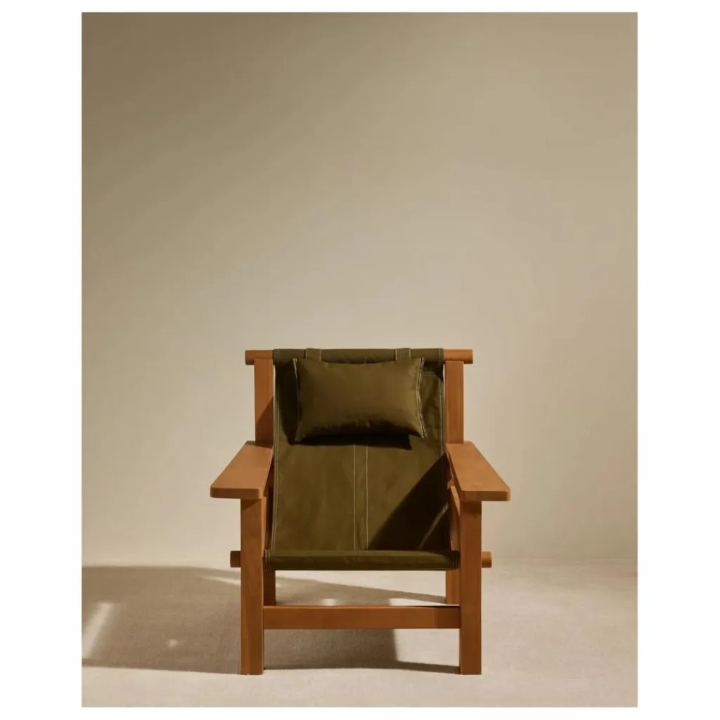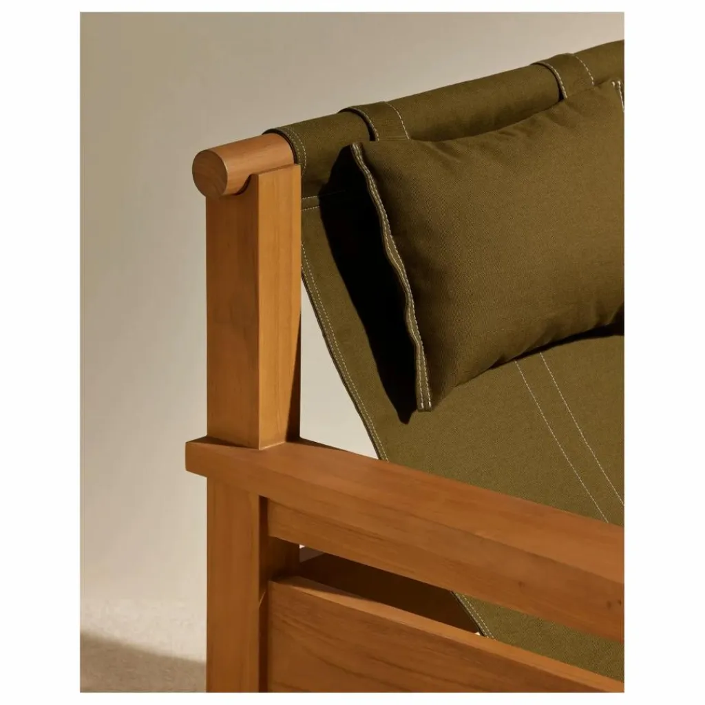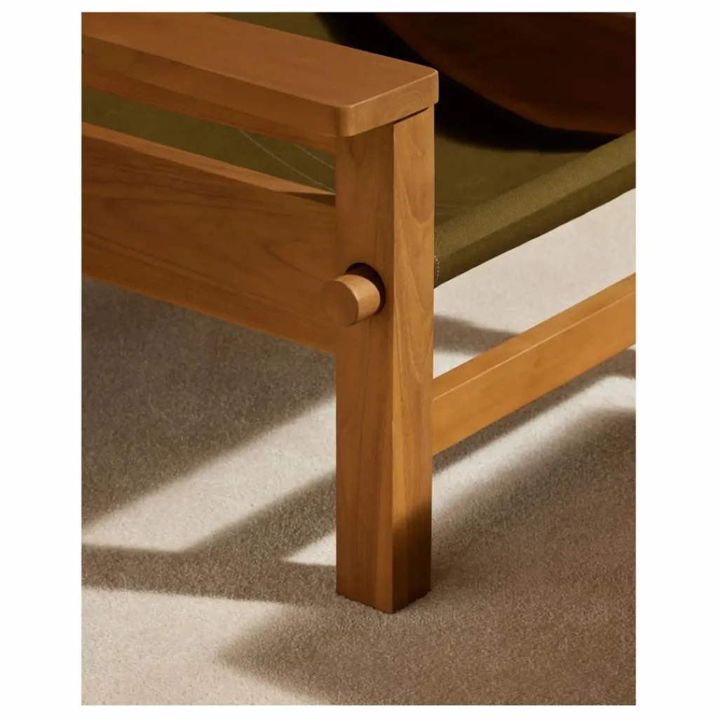 Conçu en bois noble et imputrescible, le teck de Java – label Forêts durables – ce lounge chair arbore une bâche de coton Canvas avec piqure sellier.