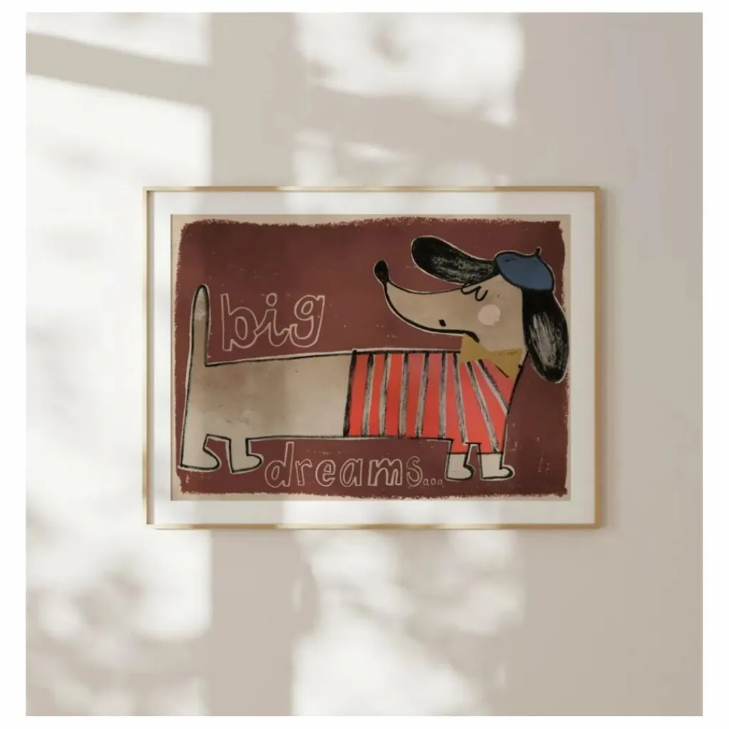 Avec son adorable teckel au regard espiègle, cette affiche est accompagnée de la phrase inspirante « Big Dreams », ce qui en fait une œuvre parfaite pour insuffler ambition, créativité et joie dans n’importe quelle pièce. Que vous soyez un amoureux des chiens ou simplement adepte d’art motivant, cette affiche ajoutera une touche chaleureuse et joyeuse à votre maison.