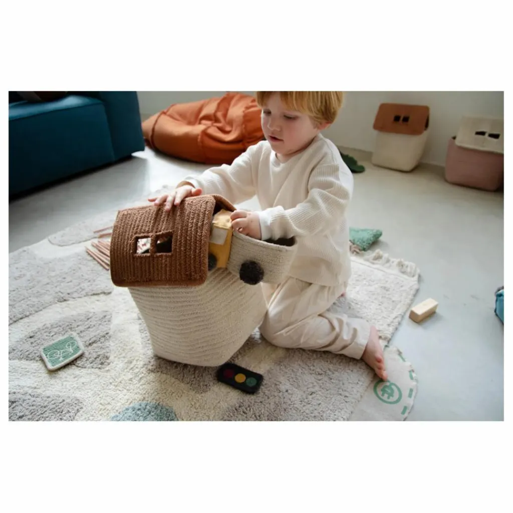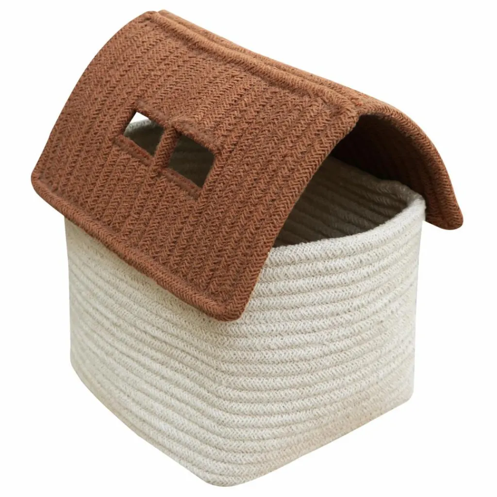 - Panier décoratif en forme de maison. Fabriqué à partir de cordes de coton tressées très épaisses et fabriqué à la main dans une forme carrée, le panier est couronné d’un toit à pignon de couleur contrastée avec des fenêtres découpées. Le toit est fixé à la partie inférieure du panier, laissant une ouverture triangulaire des deux côtés, qui sert d’ouverture de rangement.