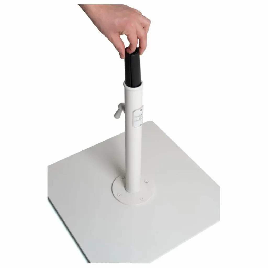 - Base et plaque de montage pré-assemblées, Mât vertical avec poignée, Inserts de mât pour mâts de parasols plus fins, Pieds de mise à niveau (pour terrasses et patios – surfaces planes et dures)