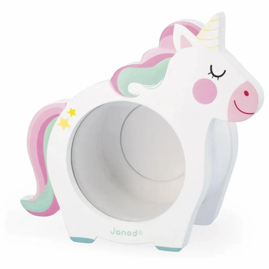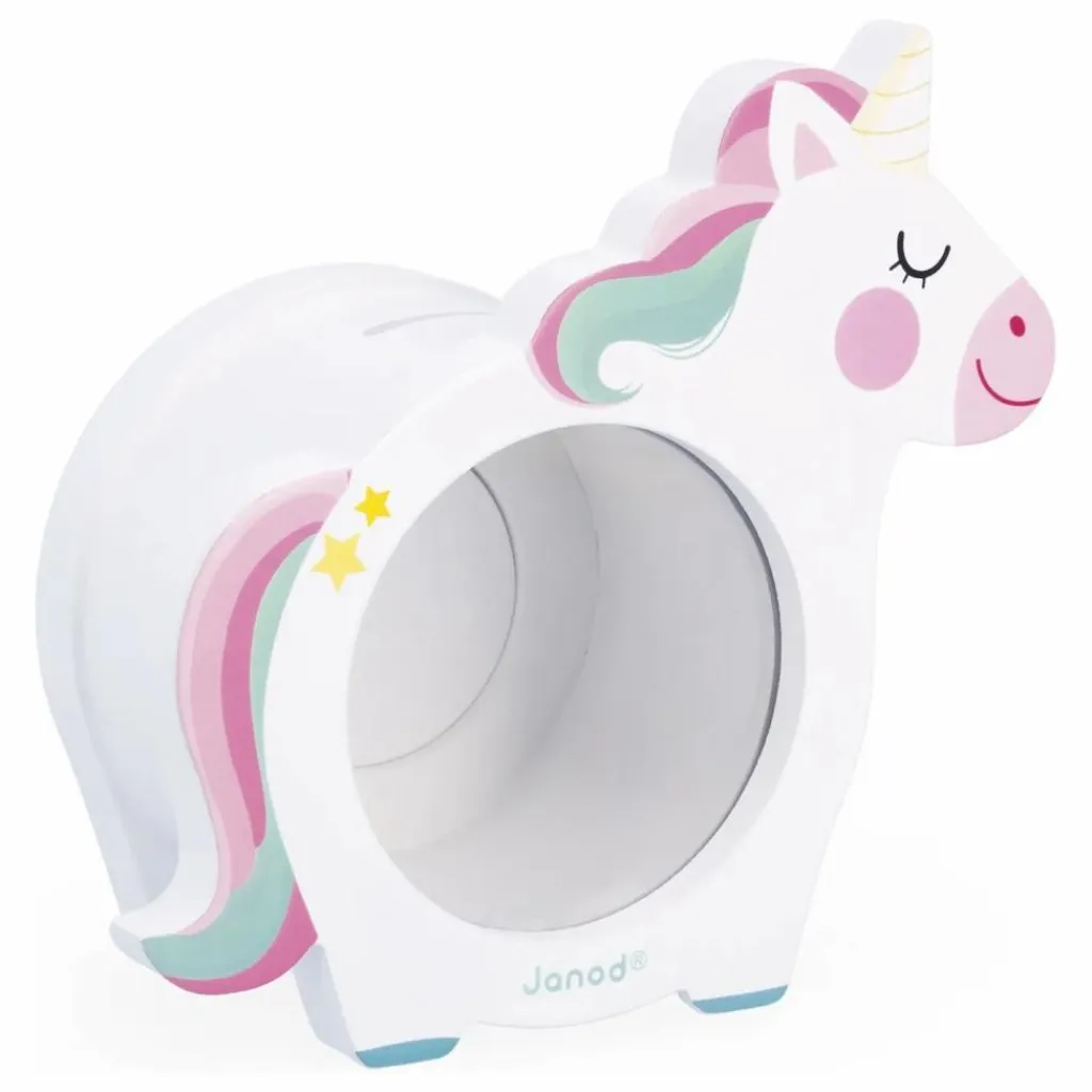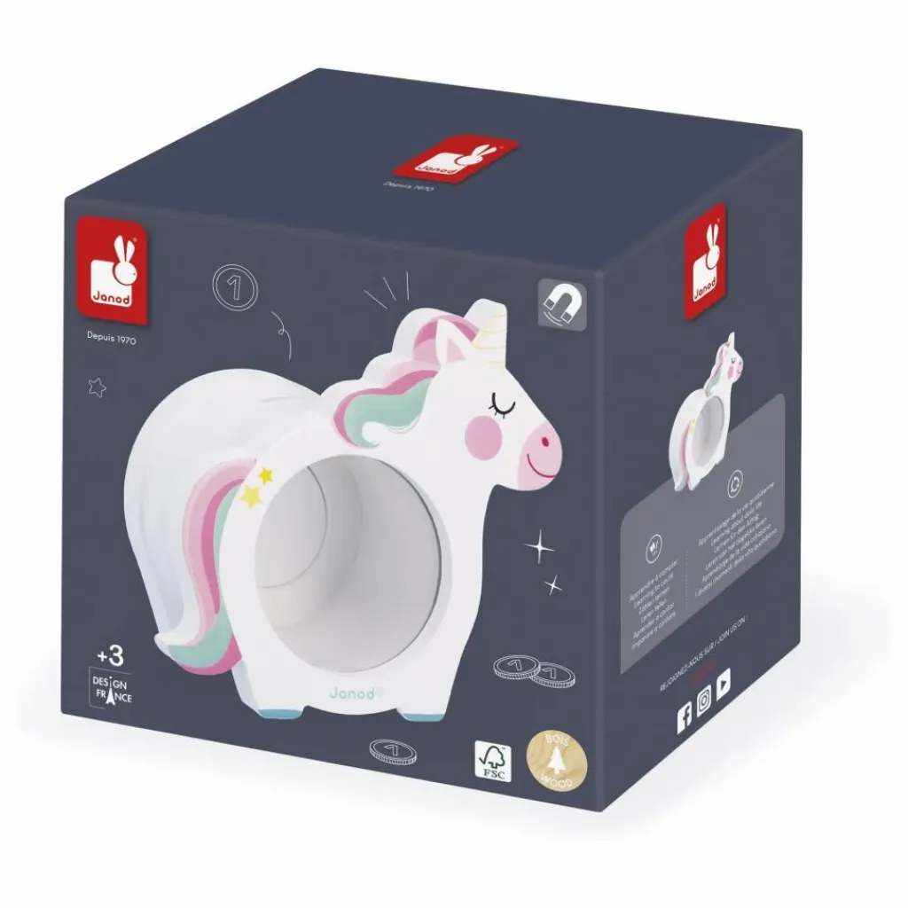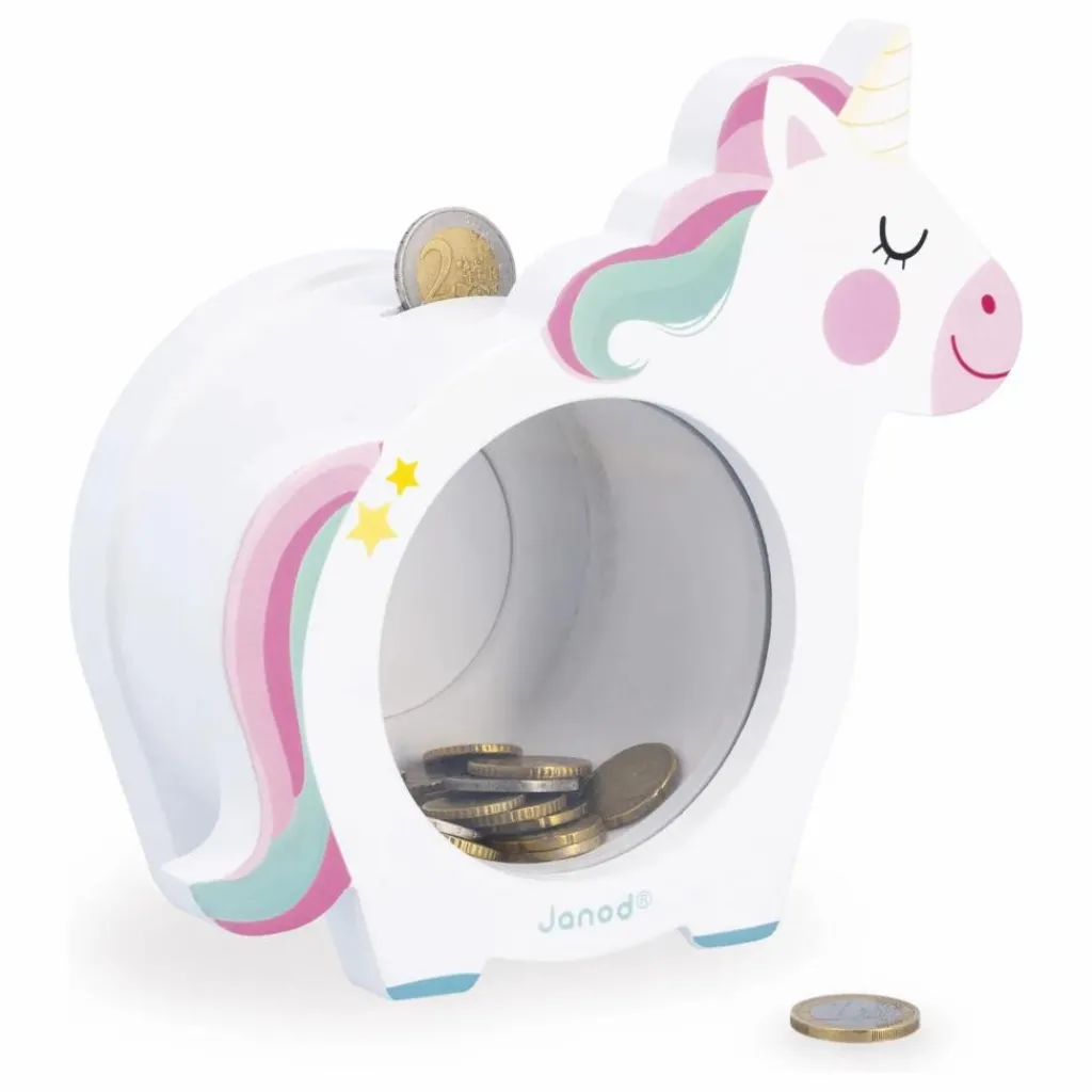 - Une jolie tirelire sur le thème licorne pour permettre à votre enfant d’épargner pièces et billets tout au long de l’année. Avec le ventre transparent de l’animal, le suivi des économies, c’est facile ! Retrait facile grâce à l’ouverture magnétique située à l’arrière. Produit en bois FSCTM pour les enfants à partir de 3 ans.