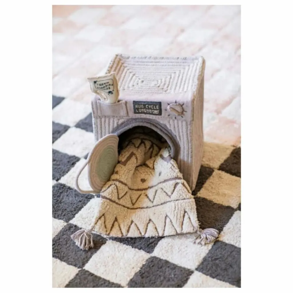 - Inspiré des sols en céramique vintage, le tapis Kitchen Tiles présente un motif à carreaux jouant avec des couleurs contrastées naturelles et gris foncé. Le tapis utilisait notre base en mélange RugCycled / toile naturelle, laissant la base légèrement visible entre les carrés colorés simulant les carreaux de la cuisine.